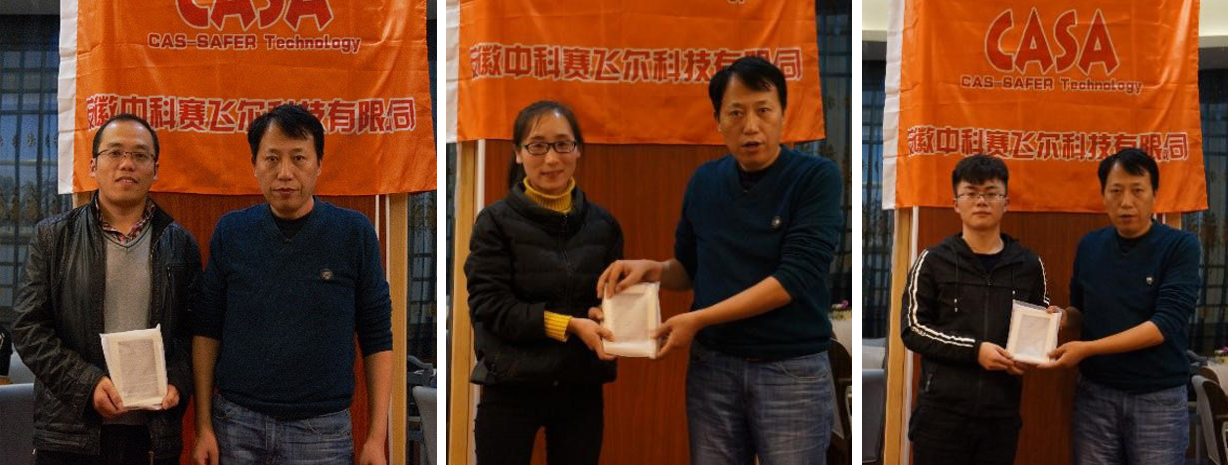 聚会第三项内容,公司董事长杨良保研究员宣布公司2018年第三、四号嘉奖令,对前期在科技强警项目和省人才特支计划中做出突出成绩的唐祥虎副研究员,董荣录博士,周旭光同志提出表扬,并给予1000元-6000元的物质奖励。